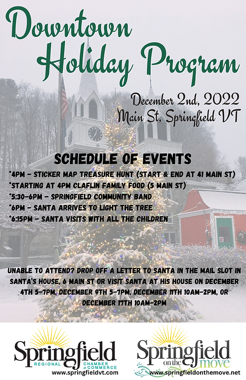 *4pm – Sticker Map Treasure Hunt (start & end at 41 Main St)*Starting at 4pm Claflin Family Food (5 Main St)*5:30-6pm – Springfield Community Band*6pm – SANTA ARRIVES to light the tree (6 Main St)*6:15pm – Santa visits with all the children